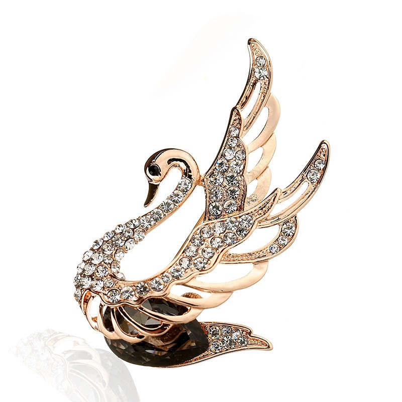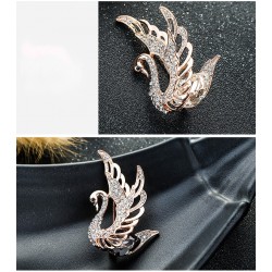 Луксозна, позлатена брошка лебед, инкрустирана с кристали. Изключително качествено изработена, не потъмнява, не променя цвета си с времето, не съдържа никел и не причинява алергии.18 каратово розе голд златно покритие на металните елементи. Големина на фигурата 56х36мм. Опакованa в луксозна кутия, към брошката е включен сертификат.