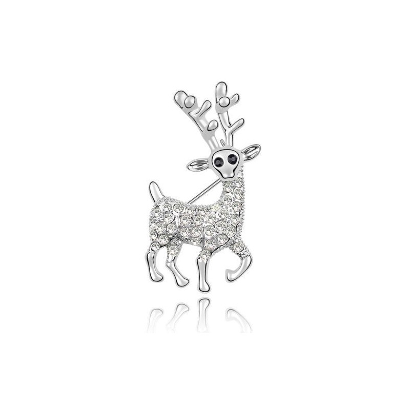 Луксозна позлатена брошка еленче инкрустирана с кристали . Материал на металната част специална бижутерийна сплав - не потъмнява, не променя цвета си, без съдържание на никел, не причинява алергии.18 каратово бяло златно покритие на металните елементи.Големина на фигурата 40х24мм.При поръчка получавате безплатно луксозна кутия и сертификат.