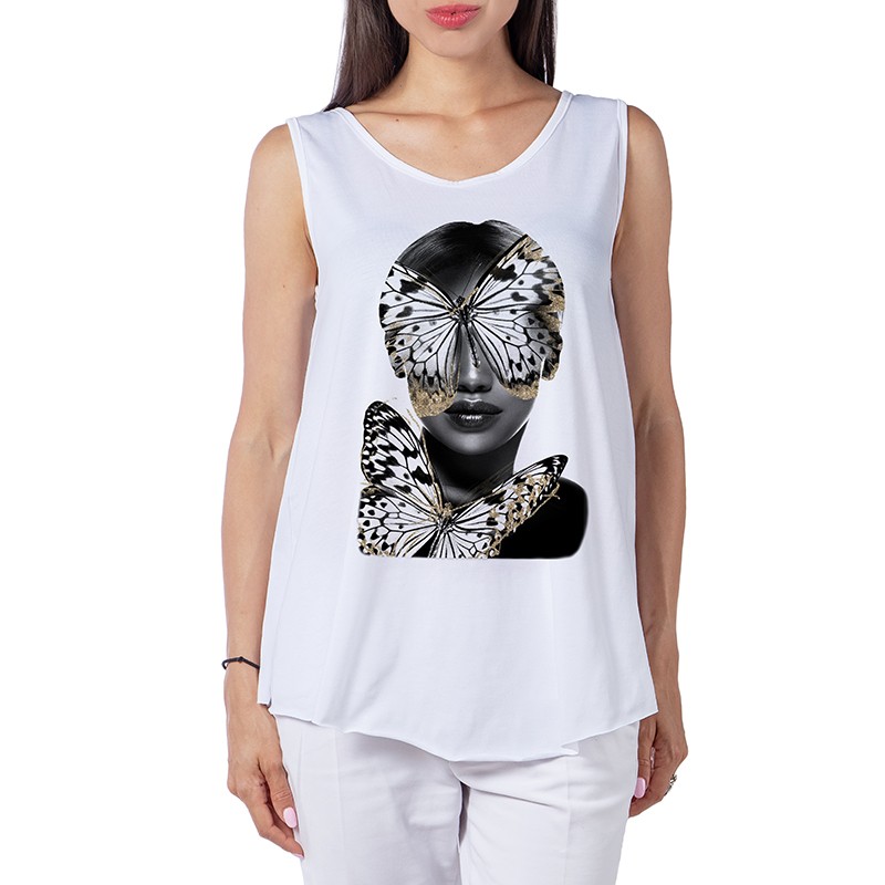 Прекрасен Дамският потник, модел e подходящ за летните горещини, с удобна и широка кройка. Широки презрамки за по вече свобода, с дигитален 3D принт предаващ индивидуалност.