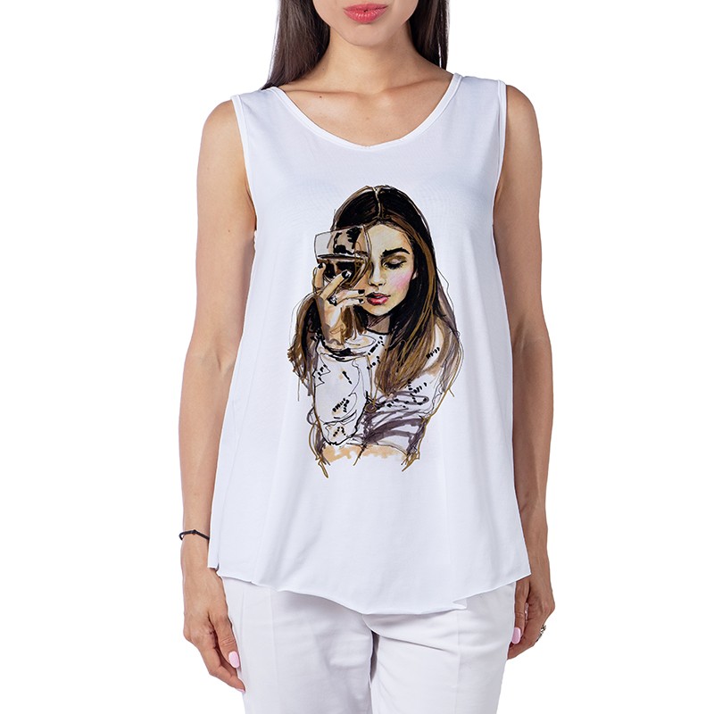 Прекрасен Дамският потник, модел e подходящ за летните горещини, с удобна и широка кройка. Широки презрамки за по вече свобода, с дигитален 3D принт предаващ индивидуалност.