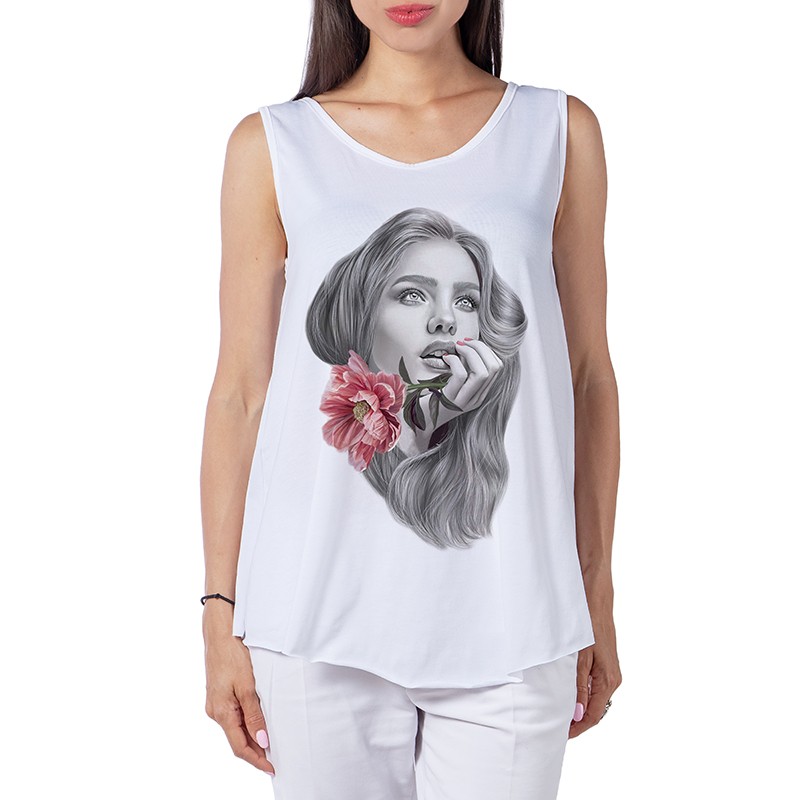 Прекрасен Дамският потник, модел e подходящ за летните горещини, с удобна и широка кройка. Широки презрамки за по вече свобода, с дигитален 3D принт предаващ индивидуалност.