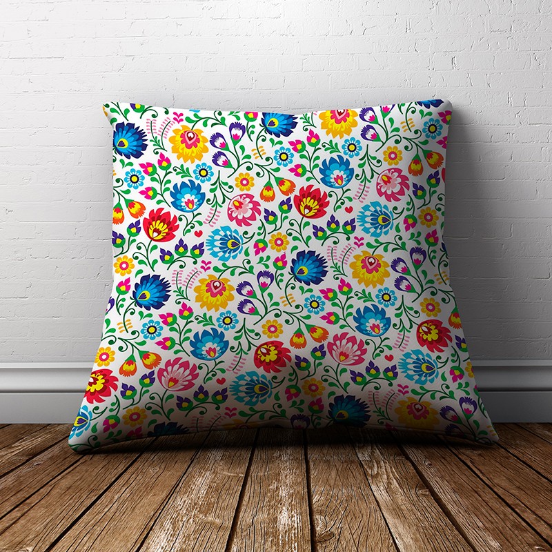 Пухкава декоративна възглавничка с цветен принт.