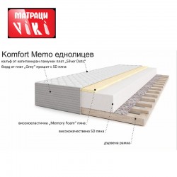 Еднолицевият матрак Комфорт Мемо е изграден върху здрава рамка от суха иглолистна дървесина. Ядрото му е съставено от висококачествени SD и Мемори пяна. Калъфа на матрака е изграден от капитонирана памучна дамаска, подсилена със защитен олекотен филц, тип Spunbond и силиконова вата и дунапрен.