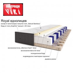 Еднолицевият матрак Роял е изграден върху здрава рамка от суха иглолистна дървесина. Ядрото му е съставено от индивидуално пакетирани пружини Покет, и по един слой висококачествени SD и Мемори пяна. Калъфката на матрака е изградена от капитонирана памучна дамаска, под която е поставен защитен олекотен филц тип Spunbond и силиконова вата и дунапрен.