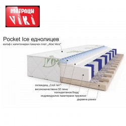 Еднолицевият матрак „Покет АЙС“ е изграден върху здрава рамка от суха иглолистна дървесина. Ядрото му е съставено от индивидуално пакетирани пружини Покет, слой от висококачествена SD пяна и профилиран охлаждащ мемори гел. Матрака е с полиуретанов борд и висококачествена памучна дамаска „Aloe Vera”, под която е поставен защитен олекотен филц тип Spunbond и силиконова вата.