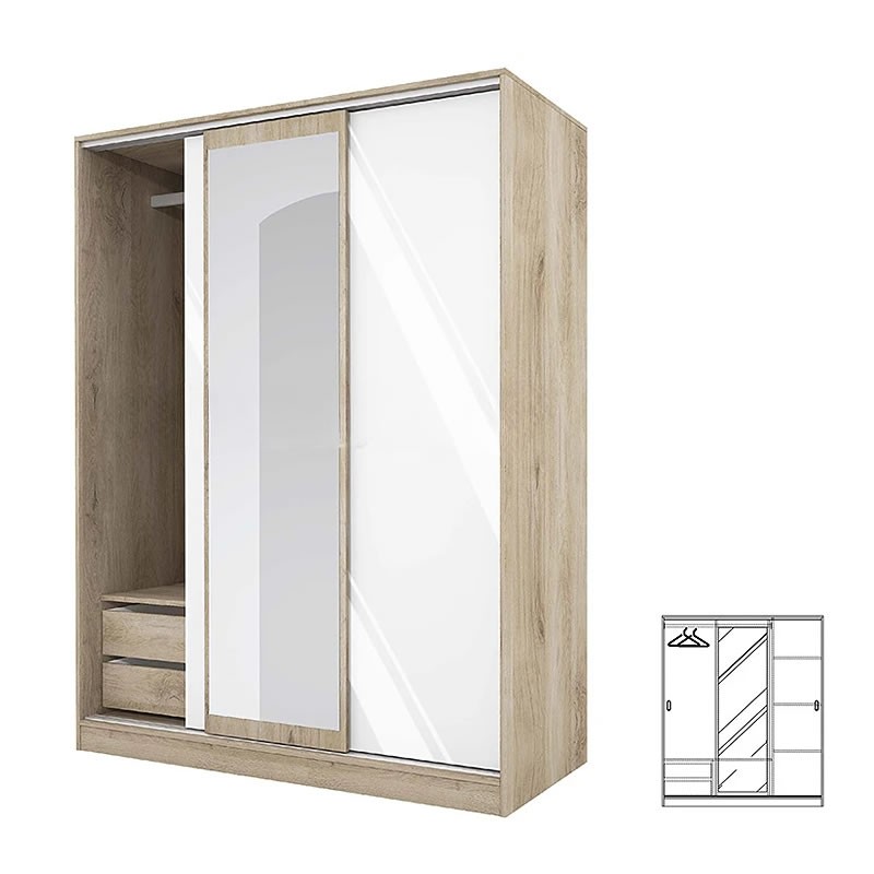 Трикриленият гардероб с огледало и плъзгащи врати е перфектното съчетание между стилен външен вид и практична функционалност. Създаден да отговори на нуждите на модерния дом, този гардероб не само предлага щедро пространство за съхранение, но и допринася за естетиката на вашия интериор с елегантното си огледало и плъзгащи врати. Изработен от висококачествено ПДЧ с дебелина 16 мм, той гарантира дълготрайност и устойчивост.