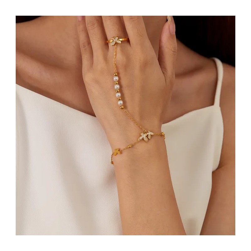 Ефектно бижу, съчетание между гривна и пръстен свързани с нежна верижка, подходяща за нежни и романтични дами с усет към красивото. Пръстенът е отворен с регулируем размер. Перфектно качество на изработка, модерен и красив дизайн. Луксозна кутийка и сертификат на марката.