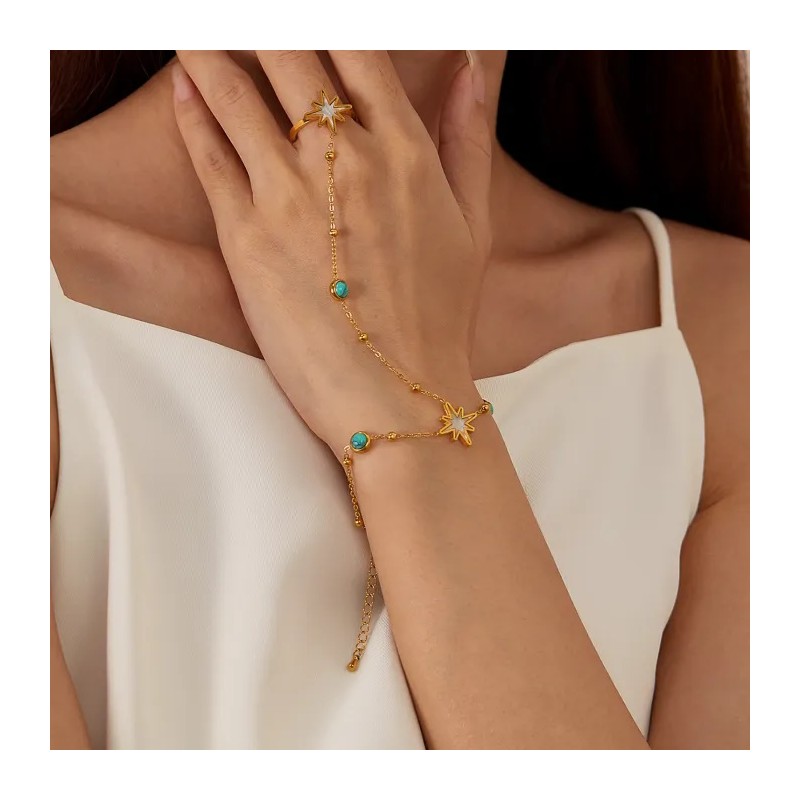 Ефектно бижу, съчетание между гривна и пръстен свързани с нежна верижка, подходяща за нежни и романтични дами с усет към красивото. Пръстенът е отворен с регулируем размер. Перфектно качество на изработка, модерен и красив дизайн. Луксозна кутийка и сертификат на марката.