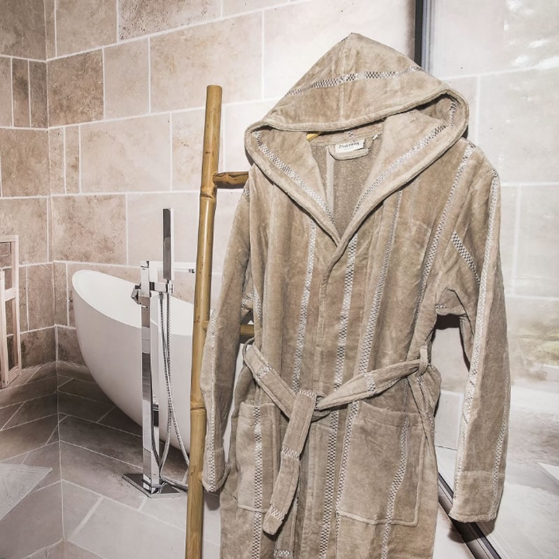Изживейте лукса с мъжкия халат Моника - вашата ежедневна доза мекота и комфорт след баня. Изработен от 100% висококачествен памук с грамаж 400 гр/кв.м., той гарантира отлична попиваемост и нежно докосване до кожата. Предлага се в елегантна опаковка, идеална за подарък.