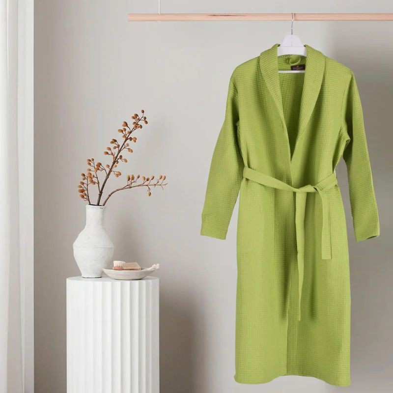 Представяме ви халата за баня с яка с шал Вафел - върховният комфорт и стил! Изработен от луксозна изцяло памучна материя тип вафла, този халат за баня е невероятно лек и удобен, което го прави идеален за всички сезони. Със своята яка с шал, джобове и колан с двойна гайка той е и невероятно удобен - позволява ви да се отпуснете със стил, без да се притеснявате за нищо на света!