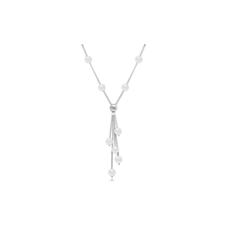 Ефектно колие декорирано с кристални перли , захванати с красиво фасетиран кристал в центъра. Елегантен и нежен, нов модел, който впечатлява с модерната си визия. Колието е позлатено с 18 каратово бяло, златно покритие. Големина на перлите 5 мм., дължина на висящия мотив 67 мм. Изработено от ювелирна сплав с много високо качество, анти алергично и изключително блестящо. Опаковано в елегантна, подаръчна кутия, със сертификат.