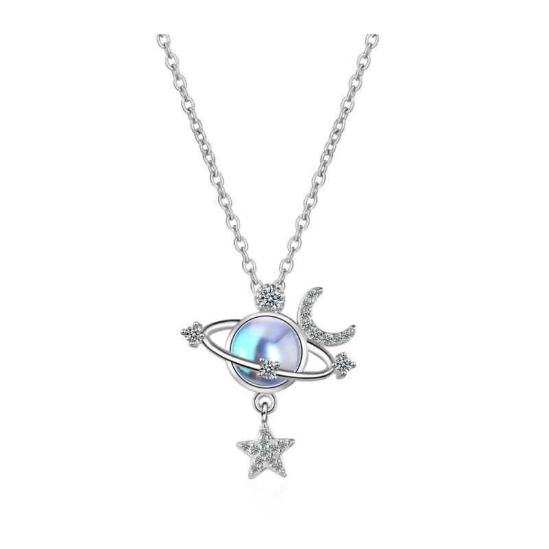 Ефектно, позлатено колие, инкрустирано с блестящ цирконии и кристал тип лунен камък. Изключително качествена изработка, нежен и елегантен дизайн. Металната част не причинява алергии не съдържа никел. Покритието на колието е 18 каратово бяло позлатяване, което помага блясъка му да е великолепен и дълготраен.