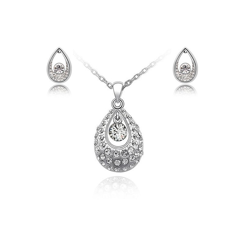 Луксозен позлатен комплект на марката -бижута инкрустирани с кристали . Изработен изключително качествено и прецизно, материалът е доказано антиалергичен и не предизвиква алергии. С 18 каратово бяло, златно покритие на металните елементи.Дължина на синджирчето 40 см с допълнително удължаващо звено от 5 см.Големина на висулката на колието 32x17мм, големина на обеците 30х15 мм., закопчават се с винт. Опакован в луксозна кутия с включен сертификат.