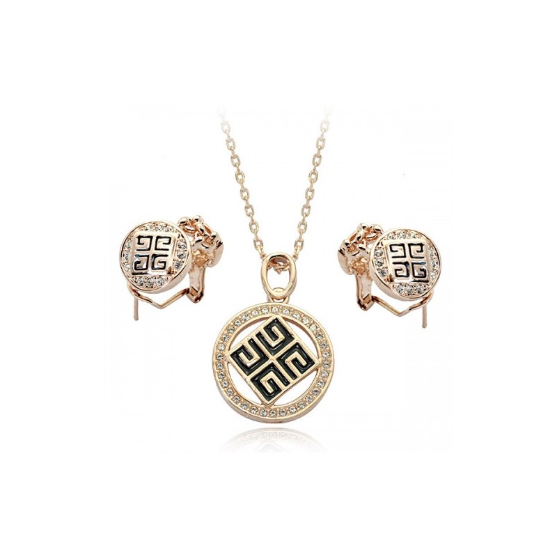 Луксозен позлатен комплект инкрустиран с бляскави кристали . Перфектно качество на изработка, красив и модерен дизайн, подходящ за дами на всяка възраст.