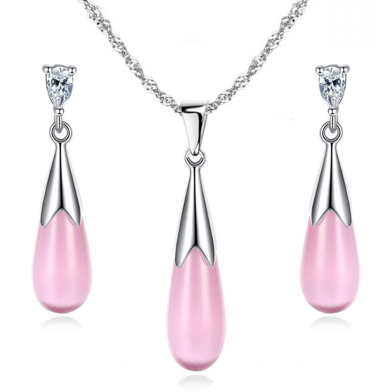 Ефектен, позлатен комплект, инкрустиран с блестящ кристал тип cat stone. Изключително качествена изработка, нежен и елегантен дизайн. Металната част не причинява алергии не съдържа никел. Покритието на колието и обеците е 18 каратово бяло позлатяване, което помага блясъка му да е великолепен и дълготраен.