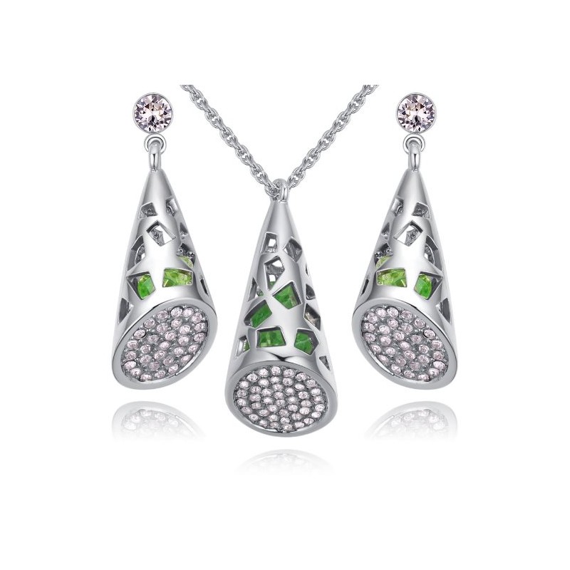 Стилен, позлатен комплект, инкрустиран с кристали . Материал на металната част специална бижутерийна сплав - не потъмнява, не променя цвета си, без съдържание на никел, не предизвиква алергии, с 18 микрона бяло златно покритие на металните елементи. Кристалите във висящите елементи са подвижни и деликатно проблясват при всяко движение.