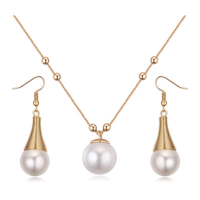 Луксозен позлатен комплект инкрустиран с бляскави, кристални перли . Перфектно качество на изработка, красив и модерен дизайн, подходящ за дами на всяка възраст.