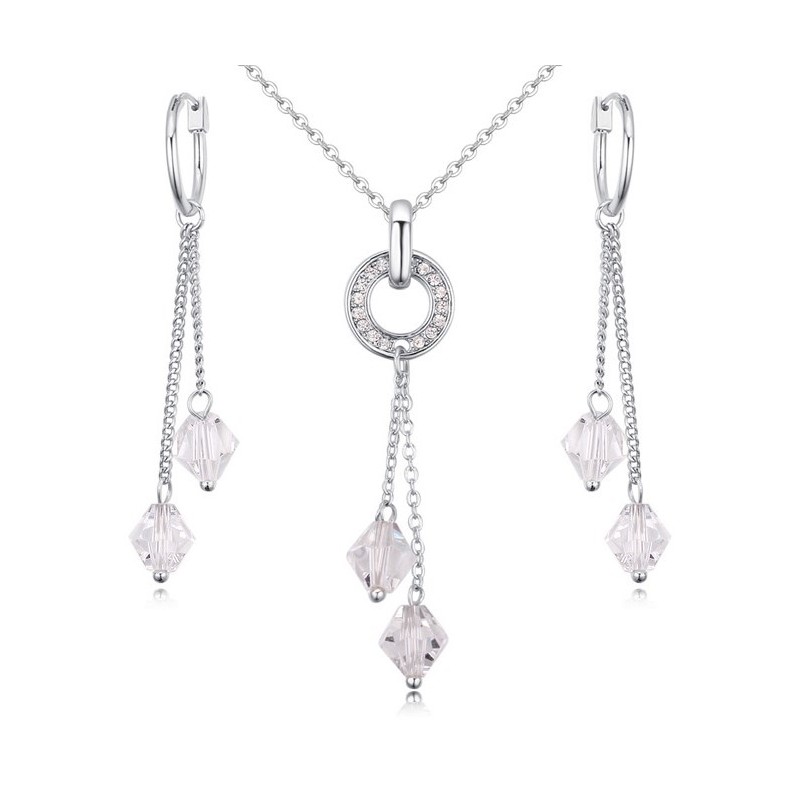 Елегантен комплект с висящи обеци, декориран с луксозни кристали . Изключително качествено изработен, анти алергичен, подходящ за стилни и изискани дами на всяка възраст. Лек и много удобен за носене. Висящите елементи са подвижни и деликатно проблясват при всяко движение.