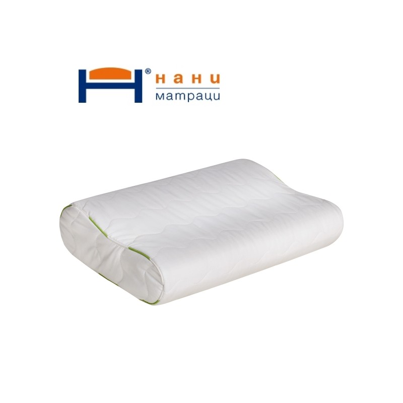Ергономична възглавница с профилирана сърцевина от мемори пяна и луксозен капитониран калъф от 100% бял памучен плат.