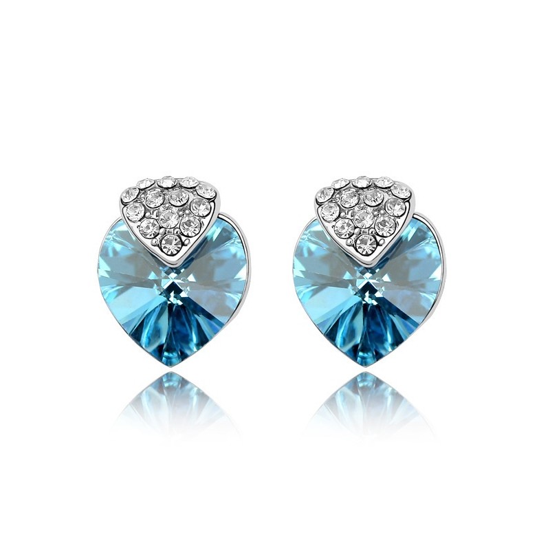 Нежно проблясващи, сини сърчица, декорирани с бели, фино фасетирани кристалчета. Задната част на обеците е с елегантен метален обков, който предпазва кристала от нараняване. Качествена и прецизна изработка, доказано антиалергични с покритие от бяло злато.Размер на сърчицата 13x10 мм, закопчаването им е с винтче, което е уплътнено със силиконов стопер, фиксиращ поставянето им на ухото.