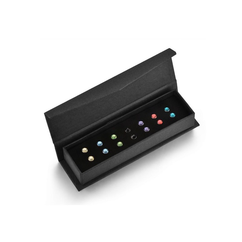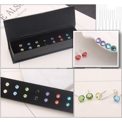 Нежен и деликатен модел обеци на търговската марка в комплект от 7 броя. Изчистената и класическа линия на обеците ги прави подходящи за всяка възраст и вкус. Материалът, от който са изработени е анти-алергичен и не съдържа никел. Позлатени са 18 каратов фин, бял микрофилм, което спомага за допълнителния им блясък и устойчивост на потъмняване. Инкрустирани са с цял, красиво фасетиран кристал .