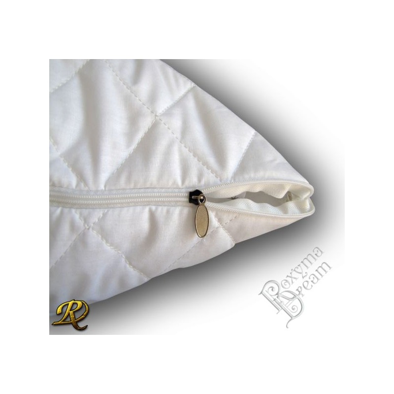 Протекторът за възглавница е прошит двустранно /плат-вата-спунбонд/ , като лицевата част е бяло хасе / 100% памук /, а вътрешната част на протектора е изработен от нетъкан текстил / спунбонд /. Протекторът се затваря с помощта на цип.