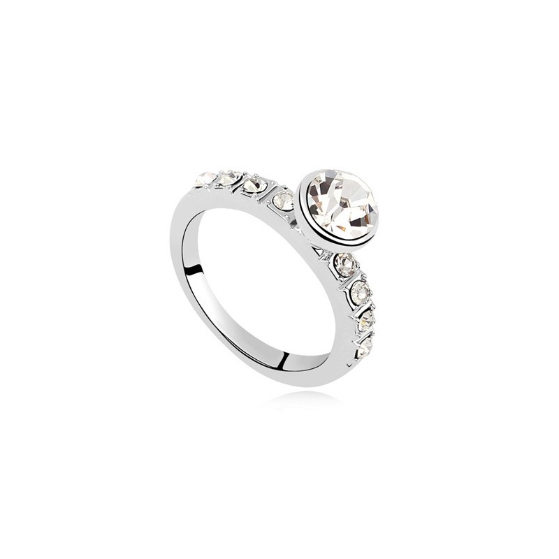 Нежен, позлатен пръстен, инкрустиран с луксозни кристали . Моделът е с отлично качество на изработка, стилен и изчистен дизайн, подходящ за всяка възраст и вкус. Позлатен с 18 каратово бяло злато, което прави блясъка му неустоим и го предпазва от потъмняване. Продуктът е опакован в луксозна подаръчна кутийка и се предлага със сертификат.