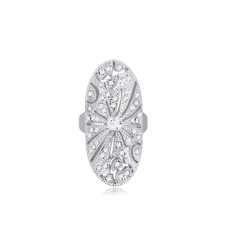 Нежен пръстен, с интересен дизайн, инкрустиран с блестящи, красиво фасетирани кристали . Моделът е с отлично качество на изработка и е подходящ за стилни и изискани дами. Позлатен с 18 каратово бяло златно покритие, което прави блясъка му неустоим и го предпазва от потъмняване. Продуктът е опакован в луксозна подаръчна кутийка и се предлага със сертификат.