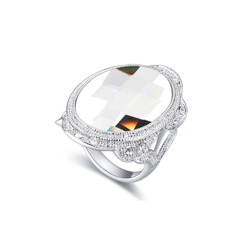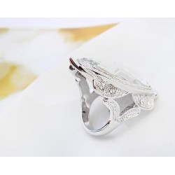 Елегантен пръстен, с красив дизайн, инкрустиран с блестящи, красиво фасетирани кристали . Моделът е с отлично качество на изработка и е подходящ за стилни и изискани дами. Позлатен с 18 каратово бяло златно покритие, което прави блясъка му неустоим и го предпазва от потъмняване. Продуктът е опакован в луксозна подаръчна кутийка и се предлага със сертификат.
