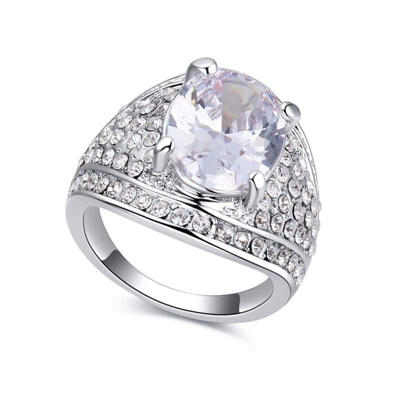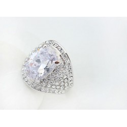 Нежен, позлатен пръстен, инкрустиран с луксозни кристали . Моделът е с отлично качество на изработка, стилен и елегантен дизайн, подходящ за изискани дами. Позлатен с 18 каратово бяло злато, което прави блясъка му неустоим и го предпазва от потъмняване. Продуктът е опакован в луксозна подаръчна кутийка и се предлага със сертификат.