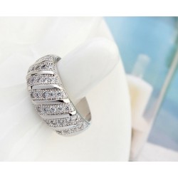 Елегантен пръстен, инкрустиран с луксозни кристали в бял прозрачен цвят. Моделът е с отлично качество на изработка и интересен дизайн. Позлатеният микро филм от 18 каратово бяло покритие прави блясъка на пръстена неустоим и го предпазва от потъмняване. Продуктът е опакован в луксозна подаръчна кутийка и се предлага със сертификат.