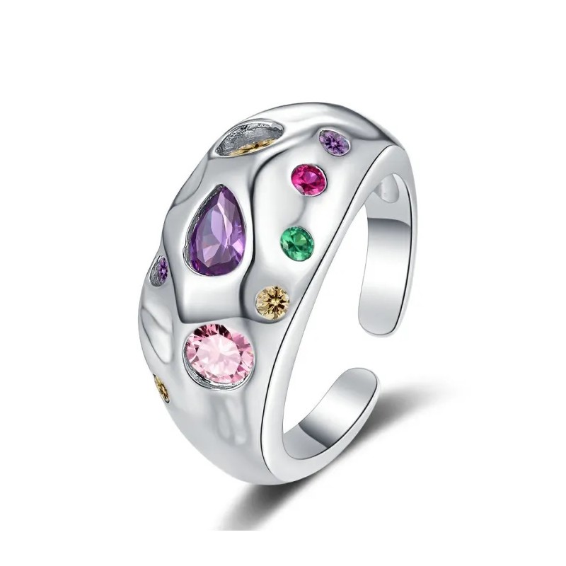 Елегантен пръстен, инкрустиран с луксозни кристали в различен цвят. Моделът е с отлично качество на изработка и интересен дизайн. Позлатеният микро филм от 18 каратово бяло покритие прави блясъка на пръстена неустоим и го предпазва от потъмняване. Продуктът е опакован в луксозна подаръчна кутийка и се предлага със сертификат.