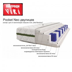 Двулицевият матрак “Покет НЕО” е изграден върху ядро от Покет пружини. За максимално удобство, от едната страна на матрака са поставени два индивидуални слоя висококачествена SD пяна, а от другата е разположен слой от висококачествена SD пяна съчетана с еластична “Air fl ow” вата подпомагаща циркулацията на въздух и допринасяща за меко усещане. Матрака е с полиуретанов борд и висококачествена памучна дамаска “Real Bamboo” под която е поставен защитен олекотен филц тип Spunbond и силиконова вата с цип. Това дава възможност калъфа да бъде свален и изпран при максимална температура 30°.