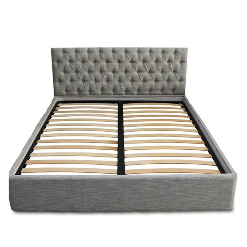 КУБ е тапицирана спалня, мека табла висока 100см за максимален комфорт при облягане. Метална подматрачна ламелна рамка и комплект механизми за повдигане на матрака.