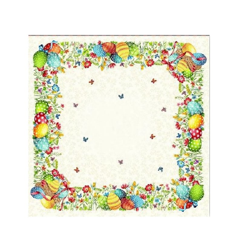 Внесете радост и празнично настроение във вашия дом с нашето великденско каре за маса. Този красив текстил е изработен от жакардов плат с десен, изобразяващ разноцветни великденски яйца и кошница с пролетни цветя.